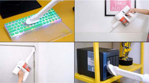 其中软绒地刷是搭配内置独立电机的,可以高速驱动宽体地刷运转,这意味着你手持的时候不需要用力,搭配地刷的万向转向设计,只需要手轻轻向左向右旋转,即可控制地刷方向,即使是小女生也可以单手轻松扫全屋。