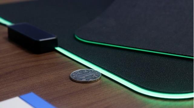 通电。整块垫子共有19个灯区,可以给每个区域都独立设置一种光效,更可以到Chroma Studio里面玩更高级的。垫子表面和这一圈灯条应该是用胶粘起来的,可以看到点痕迹,不过边缘过渡做得很平滑,手腕放上去也完全没有不适感。