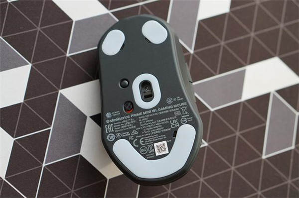 鼠标底部,传感器位置居中,左侧圆钮为灵敏度切换键,下方拨动开关为无线开关。鼠标脚贴为PTFE材质,熟悉的小伙伴应该知道,该材质具有非常低的摩擦系数,且耐寒耐热、抗酸碱有机溶剂,也是目前脚贴中比较理想的选择。
