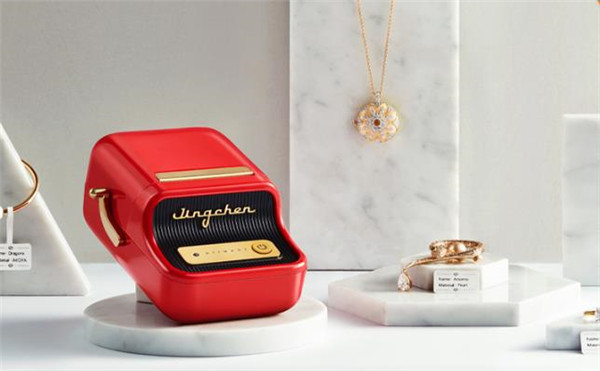 精臣B21智能标签打印机整体采用复古的典雅红,部分点缀了金色,整体的感觉就是优雅和精致,正面是一个电源按键,以及一个电源指示灯。侧边是压杆式开仓设计,向下轻轻按压,纸仓就会打开。内部有一个滚轮档杆,主要是用来固定打印纸。