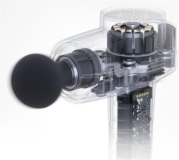 电机可以说是筋膜枪的灵魂了,直接关系着性能表现与实际体验。其所采用的24V高扭矩无刷电机以HALL-SENSOR取代碳刷换向器,以铷铁硼作为转子的永磁材料,其性能相较传统的直流电机有着大幅的提升,它并没有后者碳刷滑块的缺点,通过数字式控制可以提供2000-3600转/分钟的高频震动(振幅为10mm)。