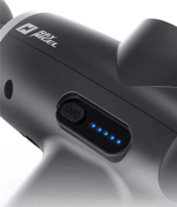 机身正中处的多功能键可以控制电机的开启、关闭以及档位的调节。雷尼格尔的这款筋膜枪共有五个档位,以满足不同群体的按摩需要。可以看到五颗指示灯对应五个档位,新手默认一档先来适应下。对于经常运动、健身的人士可以开启三、四档,五档个人感觉太过强劲,一般人根本受不了。