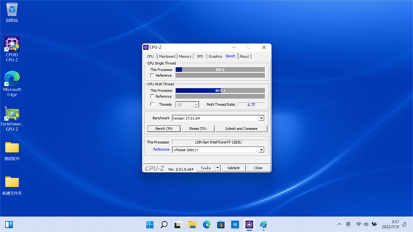 在CPU-Z的测试中,该机所搭载的英特尔12代酷睿i7-1265U处理器的单核得分681.2分,多核得分4611.1分。