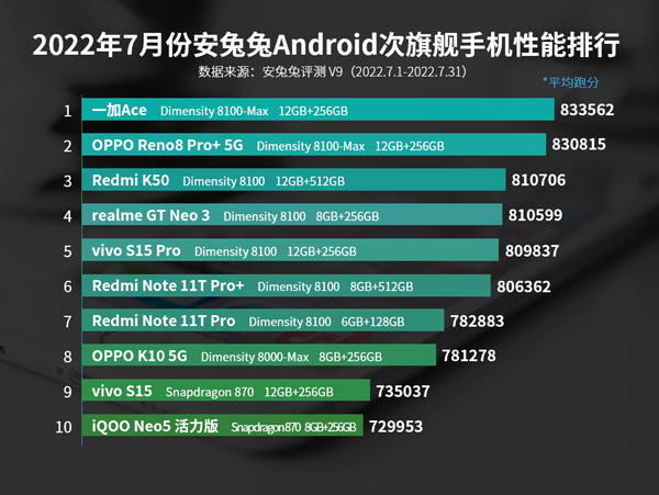7月份有多款手机发布,虽然大家并没有迫切的希望换上新手机,但厂家依旧在不断地发发发,国产手机在内卷上也达到了一个新高度。7月份的新机,市场上仅有小米12 Pro天玑版这一款旗舰手机搭载天玑9000+处理器的新机发布,所以在本次性能榜榜单中,骁龙8+制霸榜单也没有什么好惊讶的。