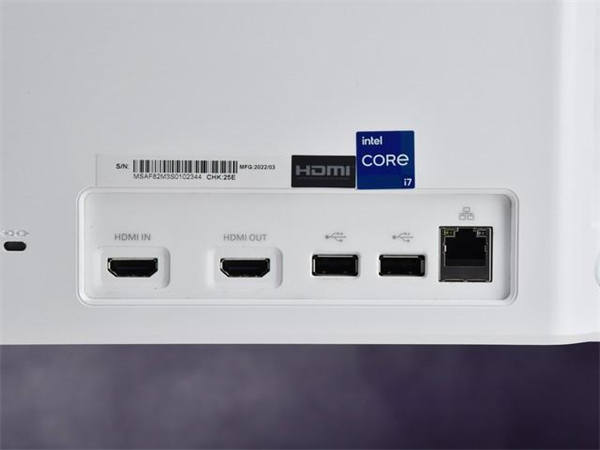 背面提供一个HDMI 输入接口和一个HDMI输出接口,可以额外拓展一个屏幕,或者用这台一体机组建双联屏办公环境。此外这里还有两个USB 2.0接口,适合接键鼠,以及一个有线网口。左侧还有一个小小的kensington锁,用于防盗。