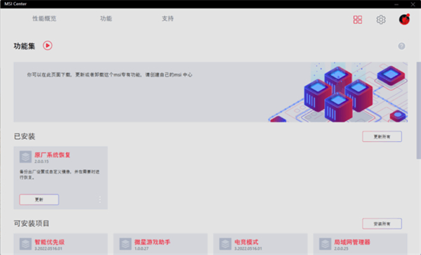 微星Modern AM272P 一体机预装了Windows 11系统,也搭载两款重磅软件,其中之一就是我们熟知的MSI Center 这款管家类软件,可以帮助用户更全面了解自己的主机,也能检测硬件信息,针对所需要的功能进行优化。