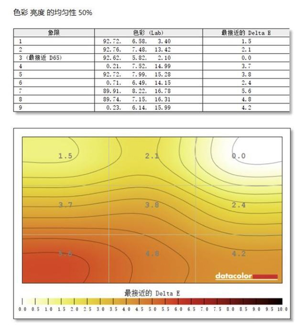 我们也测试了HKC VG273U的色彩均匀度表现,实测在50%亮度下,HKC VG273U最大色彩偏差为5.6,出现在屏幕的左下角,表现中规中矩,日常使用影响不大。