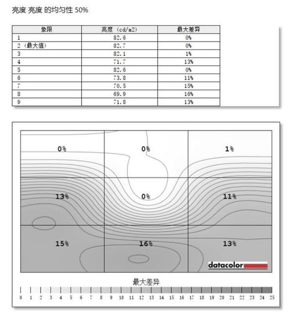亮度均匀度方面,HKC VG273U表现一般,在50%亮度下,HKC VG273U的最大偏差为16%,主要分布在屏幕下方,从实际观感看,会有屏幕下角轻微发暗的情况。当然四角发暗这也算是液晶的通病了,HKC VG273U的表现也是在可以接受的范围。