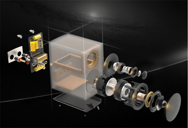 内部的结构也很有意思,因为箱体小巧空间有限。二分频设计的PCB和线缆连接柱,直接连接在一起。有效利用空间的同事,也减少了多余连接线的损失和干扰。