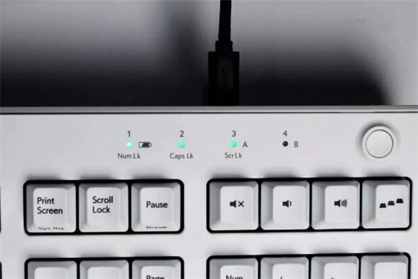 4个指示灯分别是NumLock,CapsLock,Scroll Lock,和蓝牙(Bluetooth)功能指示。