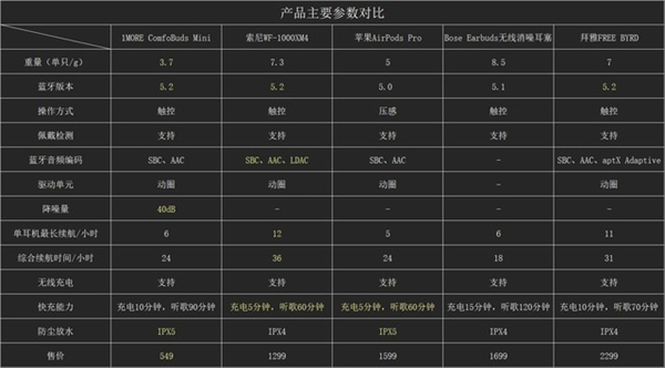 ️1MORE ComfoBuds Mini>苹果AirPods Pro>拜雅FREE BYRD>Bose Earbuds无线消噪耳塞>索尼WF-1000XM4