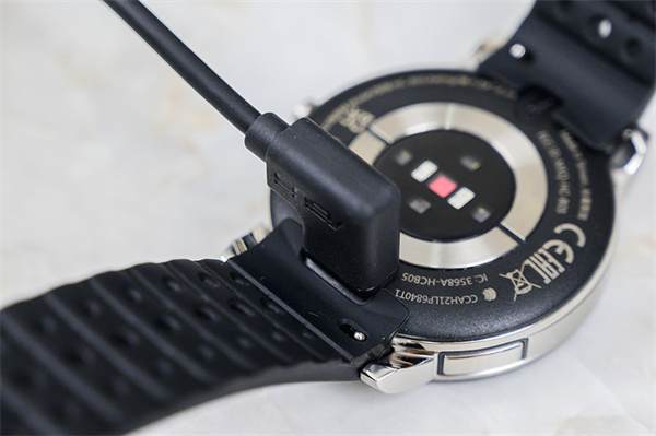 充电口则位于手表背面,采用了类似磁吸的设计,但实际是要用力插入的,使用起来稍有不便,如果是磁吸的,体验应该会更好一些。不过好在手表的续航表现还算不错,官方数据支持最长14天的使用续航,正常用的狠一点,一周一充,充电频率也是比较低的,不用经常插拔充电,也还算不太影响体验。