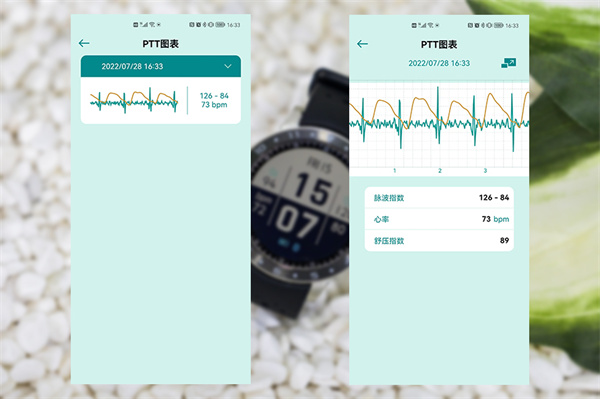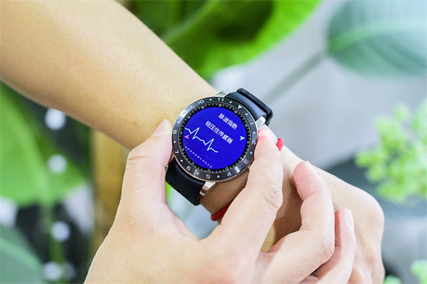 前面提到,手表的侧面也加入了传感器,因此我们随时可以利用这两颗传感器来进行测量,我们以脉波测量为了,你只需选择相应的选项,把把拇指和食指轻轻贴在传感器两侧即可,大约不到30秒的时间即可完成一次测量。