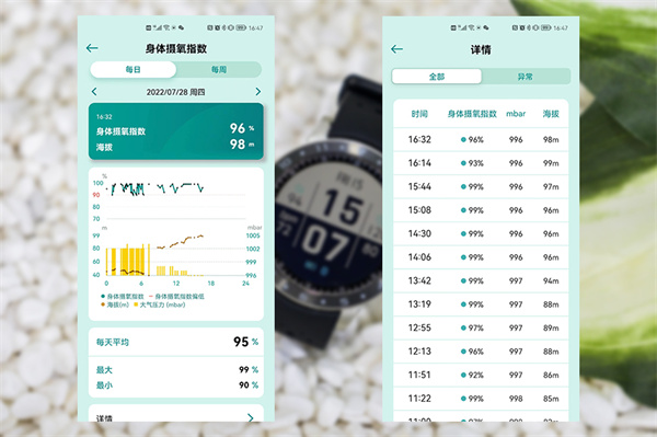 再比如身体摄氧指数(血氧),同样可以全天候持续记录,你可以看到实时的血氧指数、变化趋势,以及每一次测量记录的数据。同时结合内置的高度计,还有相应的海拔数据一同标注,这个在日常使用时可能需求不大,但如果是前往高海拔地区就比较有价值了。