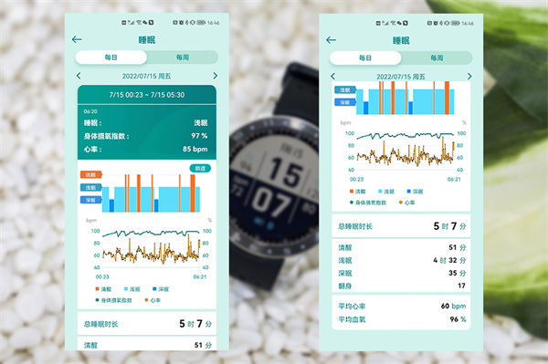 另外我们可以看到,睡眠记录的数据也是相当的详细,并且同步记录了血氧和心率数据,方便用户更加全面的了解自己的睡眠状况。
