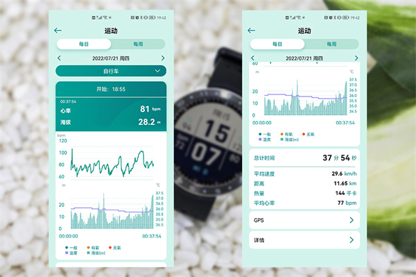 这边我也以骑行运动进行了体验,可以看到,得益于丰富的传感器,VivoWatch 5能够记录非常详尽的数据,包括最基本的骑行距离、平均速度、消耗的热量、平均心率等,此外,运动过程中,心率、体温等数据也都能详细记录,方便用户可以科学的了解自己的运动状态。当然,像是骑行轨迹、海拔变化等,也都一一记录了。