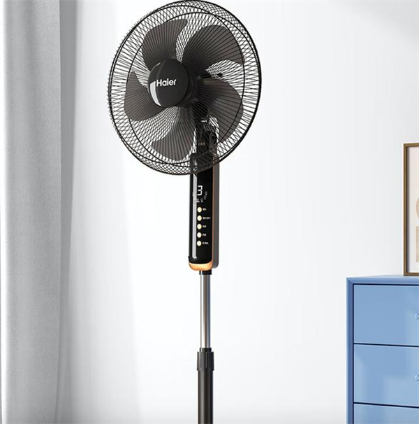 海尔电风扇HFS-Y3511B是一款家用落地扇,对比上一款更加智能一些,能远程遥控和定时预约。它的机身为黑色,有五个扇叶,不锈钢支撑杆可以调节0-20cm的高度。