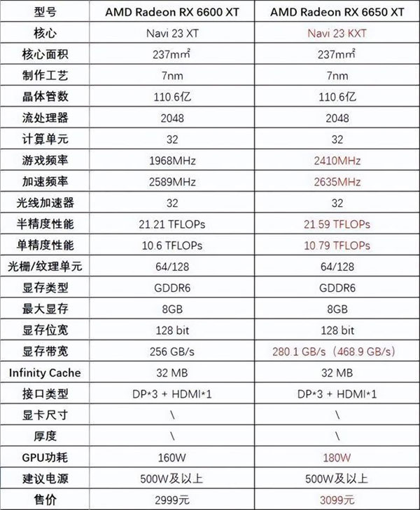 上图为RX 6600 XT与RX 6650 XT的主要参数对比,红字为变动项。可以看到虽然芯片名称有变化,但大体规格相同。需要注意的是,括号中的显存带宽为算上Infinity Cache后的最终有效带宽。