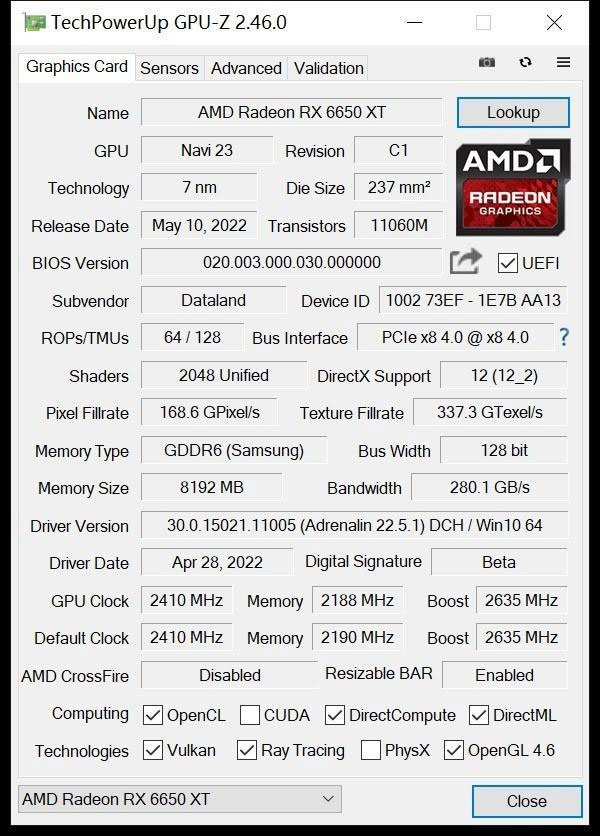 RX 6650 XT拥有64个光栅单元128个纹理单元,2048个流处理器,并且支持PCIe 4.0×8。迪兰RX 6650 XT X战将相较2600MHz的官方Boost频率有小幅提升,达到2635MHz。