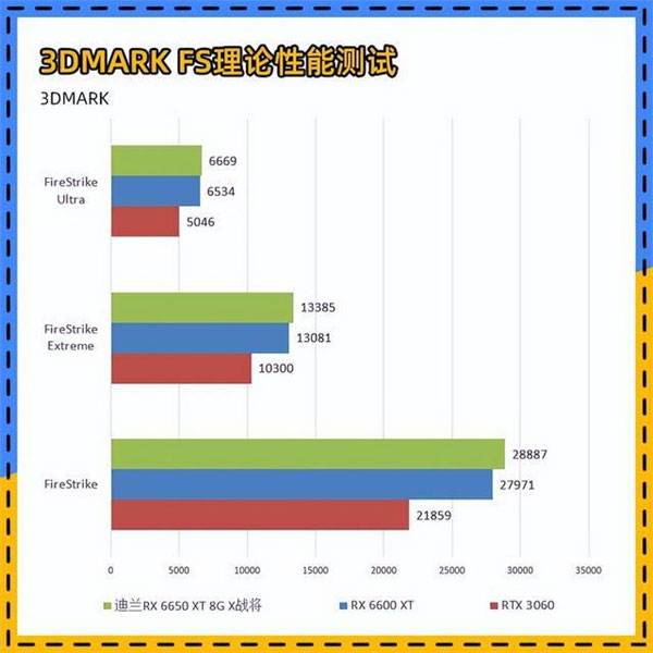 在针对显卡DX11环境的3DMARK FS套装测试中,迪兰RX 6650 XT X战将相比RX 6600 XT综合提升约为2.5%;相比RTX 3060综合提升约为31%。