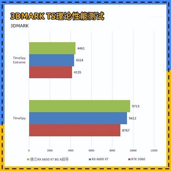 而在针对DX12环境下的Time Spy和Time Spy Extreme测试中,迪兰RX 6650 XT X战将相比RX 6600 XT综合提升约为3.2%;相较RTX 3060综合提升约为9.4%。