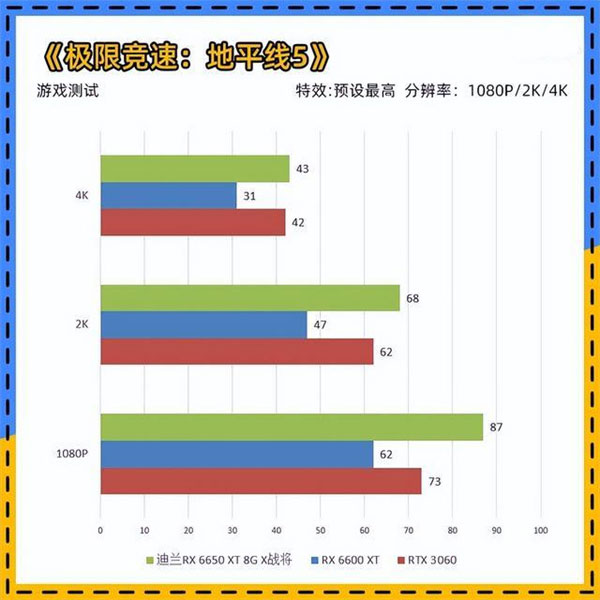 《地平线5》这款游戏对于显存要求非常高,即便在1080p分辨率下也能够达到8GB。迪兰RX 6650 XT X战将在2K分辨率下依然能够达到68帧流畅运行标准。另外赛车类游戏对于帧数的要求不高,30帧玩起来也不会感觉卡顿,所以在4K分辨率下,已然也有不错的体验。