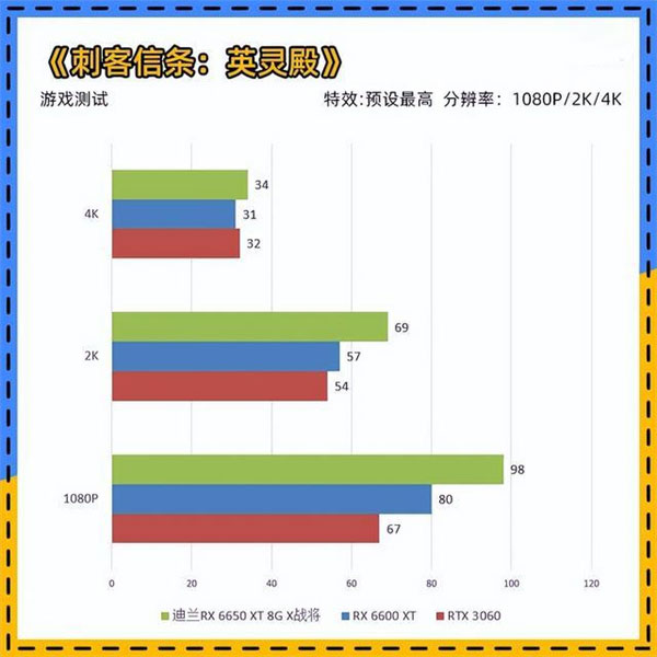 《刺客信条:英灵殿》是育碧刺客系列的最新作品,标准的3A大作,也是A卡优化强项。在1080p分辨率下,迪兰RX 6650 XT X战将相比RX 6600 XT提升显著。但是在4K超高分辨率下,与RTX 3060的分数差距依然会缩小。