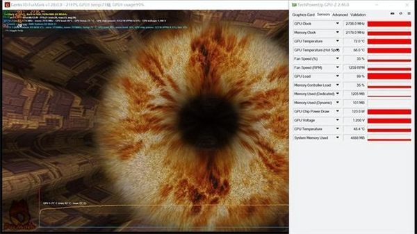 在功耗测试中,GPU-Z仅有芯片功耗,迪兰RX 6650 XT X战将的芯片功耗为123W左右,整卡功耗210W,拷机峰值温度稳定72℃。