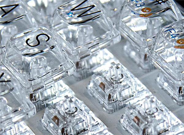 键帽的顶部都做了符合人体工学的凹陷,手指触摸在上面的时候指尖的触感不错,键帽上的字符采用了移印+UV的工艺,虽然字体是印在键帽的表面的,但是这种工艺能够延长字迹的留存时间,耐磨性还是有保障的,而且因为键帽是透明材料的,这下也不用担心键帽表面打油的现象了。