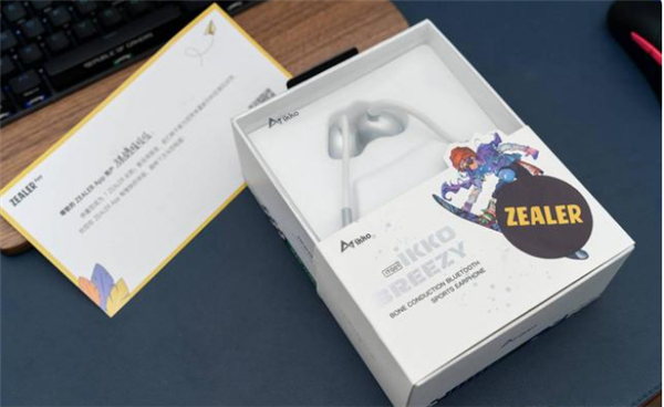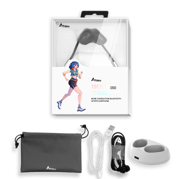 回到产品本身,包装的设计是比较灵动的,盒子比较大,整体以白色为主,小细节设计很多。有一圈纸包裹,上面有ikko的logo、型号,还有一个漫画角色,可以注意到人物的耳朵上戴着骨传导耳机。纸的上面是透明磨砂的塑料,可以直接看到耳机。