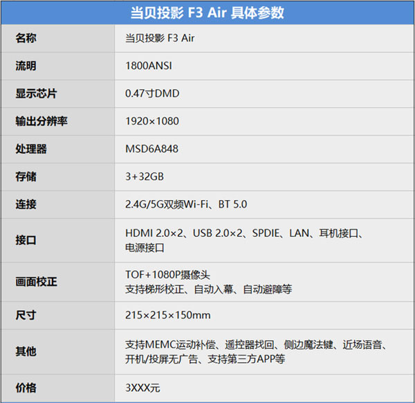 开篇简单总结一下,以下是当贝投影F3 Air值得关注的几项核心参数: