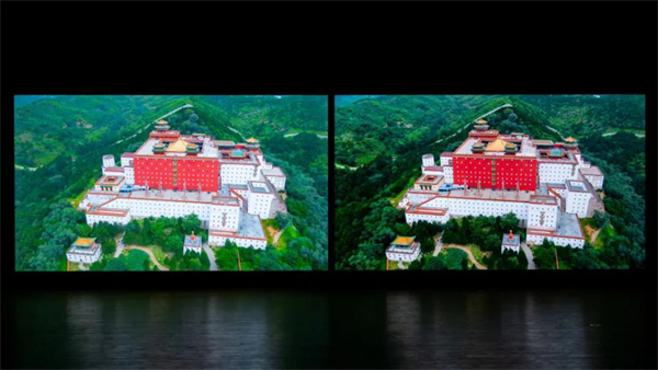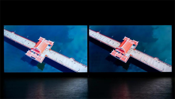 除去色彩,在明度、对比度的处理上,小米电视 ES Pro 同样更胜一筹。不论是第一张图中夕阳的色彩、处于背光处的城市建筑群,还是第二张图中红色的屋顶、彩色的廊桥,都是右侧小米电视 ES Pro 的表现更好。