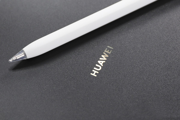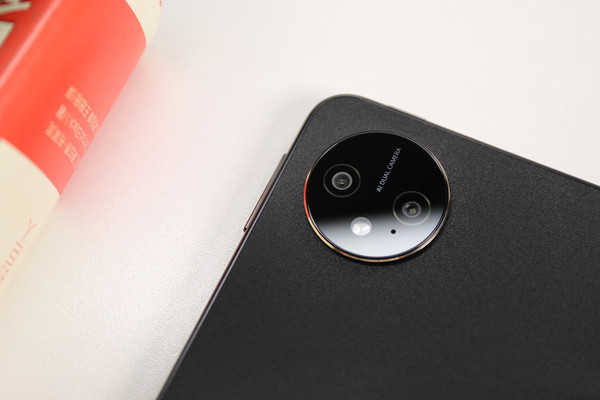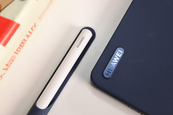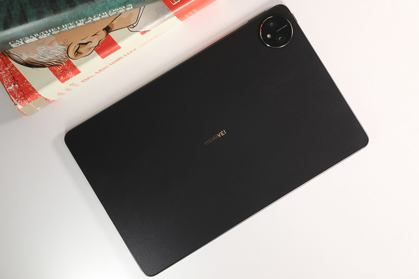 在机身背部,首先引入眼帘的是相机模组,官方称其为穹环设计,灵感来自于P系列的环形,可以说是联动上了,但是放在平板上,这种美感有待商榷。曜金黑配色是偏向于商务风的,采用了业界首创的凝霜工艺设计,摸起来有磨砂质感,不沾染指纹,而且硬度也足够耐磨,防不防摔这种还是建议大家不要尝试了。
