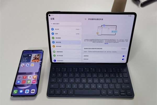 痛点一是在一些特殊场景需要用手机开热点来让笔记本或者平板电脑连接,不光费流量也容易发热耗电,尤其是在手机电量并不多的情况下,这会进一步加剧我们的电量焦虑。那么分布式网络共享解决的就是这一痛点,基于这样的能力,我们可以将手机的网络能力共享给平板,手机不用开热点,平板只需处在Wi-Fi、蓝牙范围内,登录与手机相同的华为账号,两者即可自动连接。共享之后,平板的状态栏会出现移动通信信号塔,同时底部应用增加通话、短信的应用图标显示。