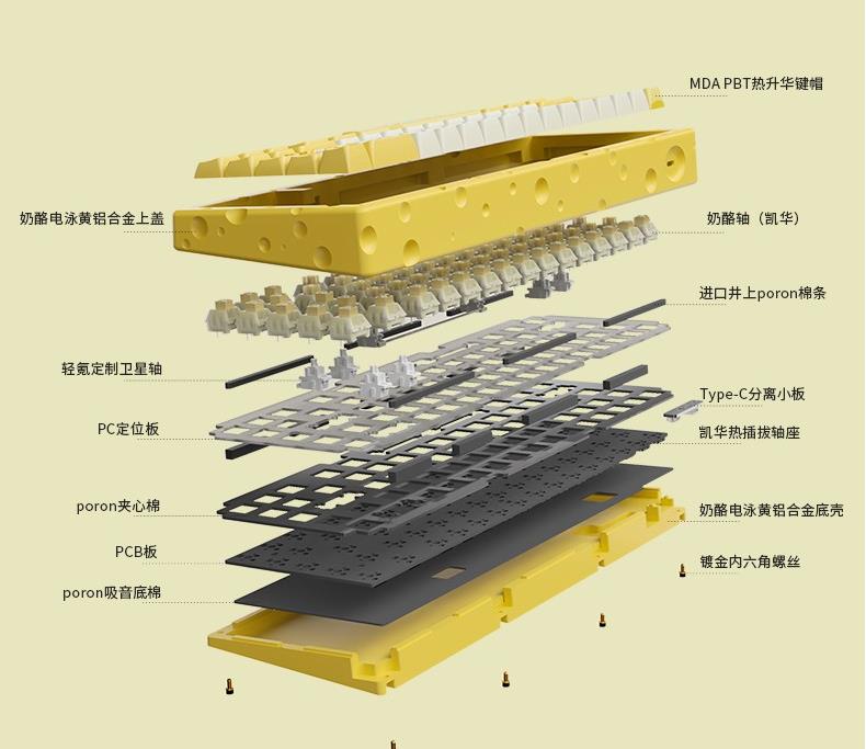 黑爵轻氪AC067奶酪主题键盘,采用了不同于传统的螺丝固定电路板的设计,而是成本更加昂贵的Gasket垫片式架构,这种结构是通过在顶部和底部外壳上设置PORON垫片,让电路板的中间悬空,避免我们在敲击键盘按键时发生内胆撞击外壳的现象,为键盘提供了更好的弹性手感和好听的敲击声。