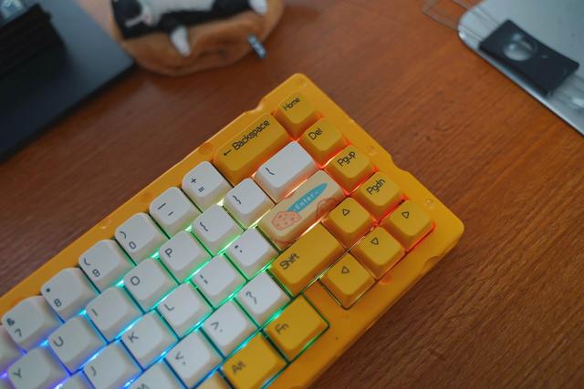 除了支持热拔插轴体之外,这款AC067奶酪主题键盘还支持RGB背光,18种灯效随意切换,通过搭配的驱动还能设置音乐律动等炫酷灯效,毕竟有线连接不需要考虑键盘的续航问题,白天或夜间都可以开灯使用,科技感十足,如果你搭配一些透光键帽,相信效果会更好。