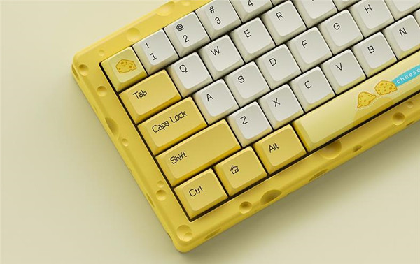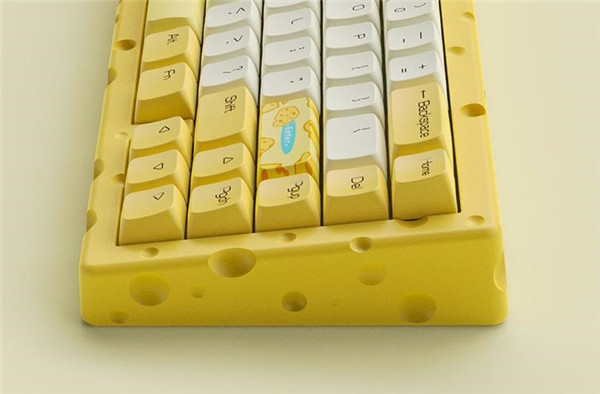 黑爵对于键帽也进行了定制化设计,采用了奶酪主题的特殊染料升华PBT键帽,球帽则是MDA高度球帽。而且黑爵还专门对空格键、回车键、ESC键专门进行了奶酪元素设计。热升华工艺处理,不掉色,点缀得十分可爱。同时,这款奶酪主题键盘还针对MAC苹果用户提供了几颗MAC增补键帽,双系统切换使用也没啥问题。