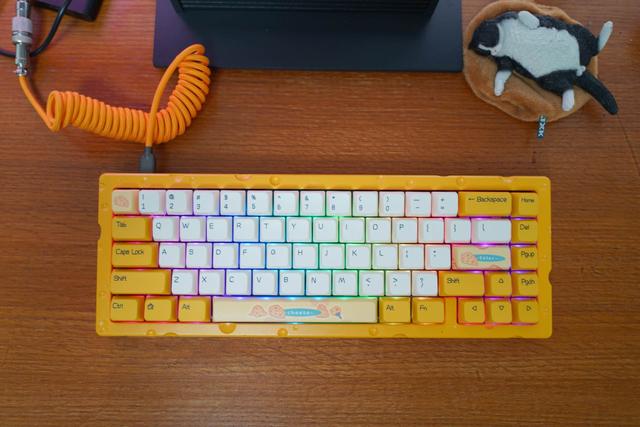 黑爵AC067奶酪键盘外观设计上,这款键盘采用紧凑型的65%配列布局,拥有67键,但这并不是它的主打卖点。拥有“杰瑞鼠”元素的奶酪主题才是主角,得益于黑爵精巧的设计,让键盘的底板部分看起来就像一块奶酪。表面像是被啃过一般,配合黄漆的外表,形象地还原了奶酪的形状。
