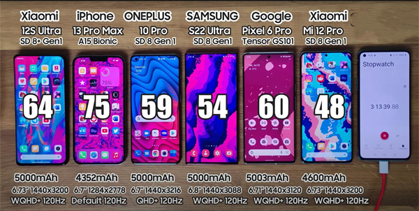 在续航3小时13分钟之后,小米12SUltra、iPhone13ProMax、一加10Pro、三星S22Ultra、谷歌Pixel6Pro、小米12Pro的电池剩余电量百分比,分别为64%、75%、59%、54%、60%、48%,电池电量剩余百分比最高的是iPhone13ProMax,电池电量剩余百分比最低的是小米12Pro。
