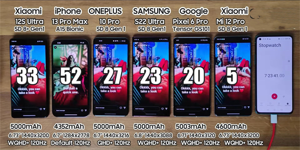 在续航7小时23分钟之后,小米12SUltra、iPhone13ProMax、一加10Pro、三星S22Ultra、谷歌Pixel6Pro、小米12Pro的电池电量百分比,分别为33%、52%、27%、23%、20%、5%,iPhone13ProMax依然是续航能力最强的手机,而当前续航能力垫底的手机是小米12Pro。