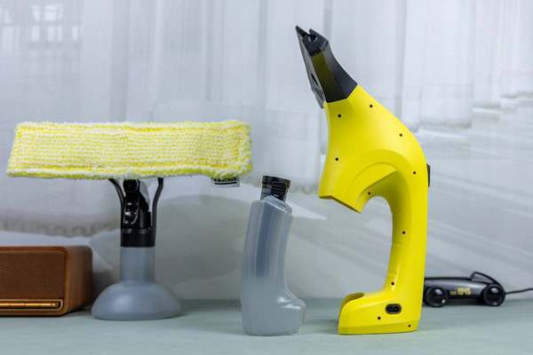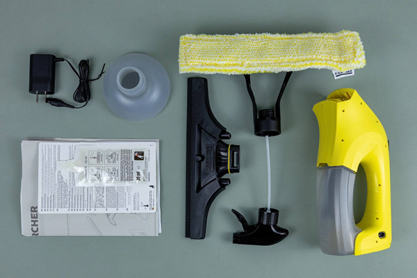 德国卡赫 WV1 Plus 镜面清洁机的包装和产品颜色一样,都加入了亮黄色的元素。从包装的信息可以看到,这款镜面清洁机除了主机外,还配套有一个带微纤维布的喷壶。