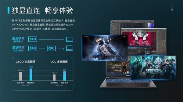 此次上新的T8系列最大亮点就是在显卡上提供了独显直连和混合模式双模技术,日常工作时可以选择混合模式,保证持久续航,而打游戏时切换为独显直连,又可以大幅降低性能损耗,混合输出,随心而动。在独显直连开启后,畅玩CSGO、LOL等高帧率游戏时,帧率提升约20%-30%。