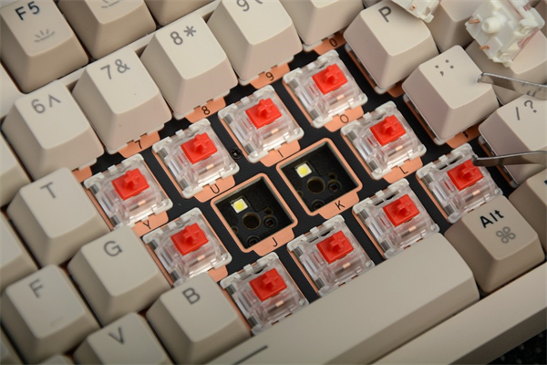 键盘采用PBT二色键帽,不易打油,键壁厚度中等,水口稍有点毛刺。