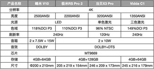 参数对比表格放在最前面,方便大家快速查找数据。4款产品均是采用德州仪器的0.47” DMD 4K解决方案和MTK MT9669 4核A73 64位CPU,其它参数各有千秋。