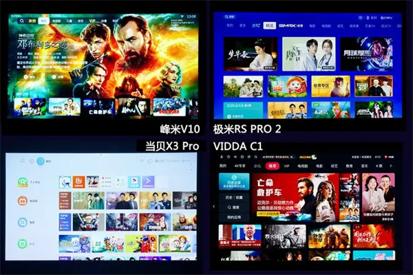 极米RS Pro 2与Vidda C1采用常规类智能电视的磁贴式布局,峰米V10的UI设计则与大多数同类产品不同,为峰米专门定制的FengOS系统,各个栏目直接推荐时下热门影片并全屏播放片花,以沉浸的方式帮助观众快速选择出自己想要看的内容。当贝X3 Pro匪夷所思的使用白色主题,看上去有些刺眼。