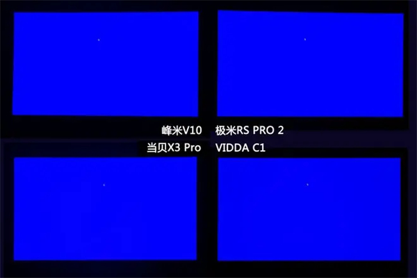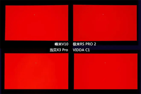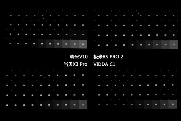 黑白灰阶测试,明场对比度不分伯仲。而峰米V10的暗场表现出乎意料的好,可识别分界的灰度区块多于其他3款,小幅领先。