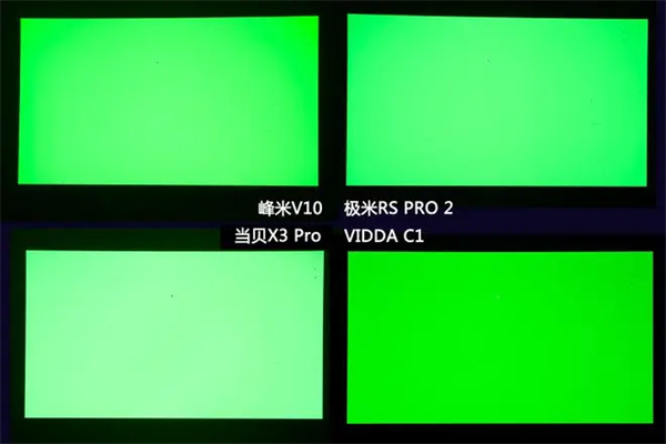 红蓝绿3原色测试,红色和蓝色区别不明显,只是Vidda C1稍稍偏暗了些。而绿色看出差距,三色激光的VIDDA C1表现优秀,其次是LED光源的峰米V10、极米RS Pro 2.单色激光的当贝X3 Pro垫底。