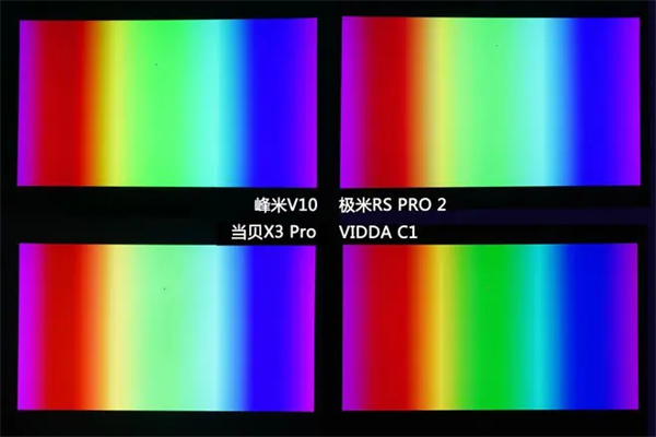 彩虹渐变测试,结果与3原色测试相仿,VIDDA C1 > 峰米V10 > 极米RS Pro 2 > 当贝X3 Pro,当贝X3 Pro饱和度过低,画面暗淡发白,由此可见一味追求高亮度不可取。