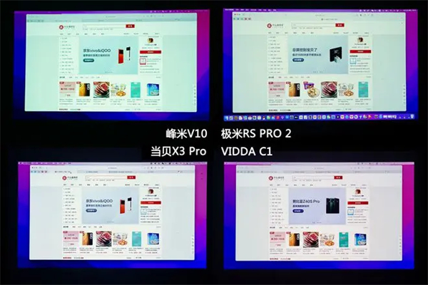 打开网页文字可读性都差不多,相机镜头拉近查看对焦情况。峰米V10和VIDDA C1文字边缘清晰锐利,像素点依稀可见。极米RS Pro 2与当贝X3 Pro虽然有些溢出,但没到影响阅读的程度。差异的原因主要出在投影镜头组的光学成像特性和ToF自动对焦的精度。