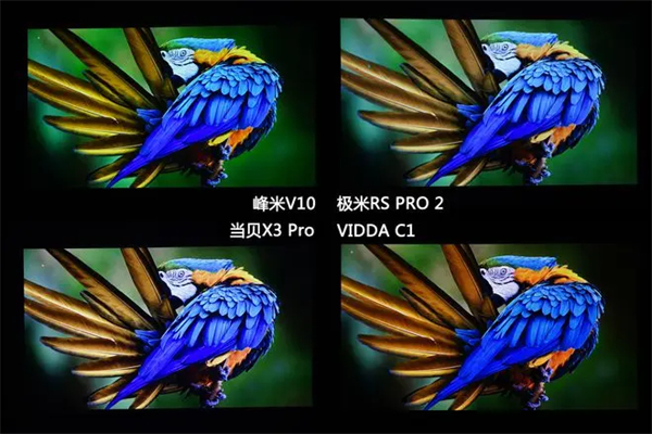 选取绚丽的照片测试在复杂构图下的色彩还原度,似乎峰米V10的画质增强技术加以介入,鹦鹉羽毛的饱和度和层次感甚至超过原图,尤其是尾巴区域的羽毛边缘深、中间亮的效果好像开了HDR。极米RS Pro 2与当贝X3 Pro偏白,羽毛颜色失去了生机。VIDDA C1亮度不足的劣势尤为突出。